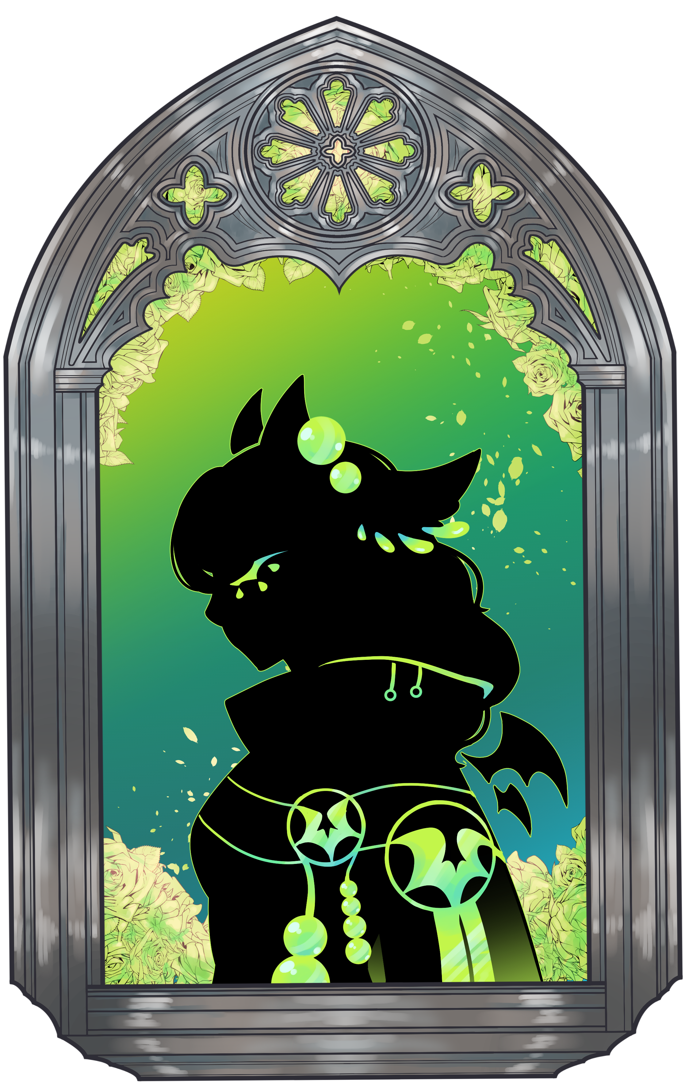 Her art focuses more on fan works and cuteness– from chibi cryptids and alien cats to “felted” stickers and actual felt plush charms. When collaborating on pieces, she lines Vashle’s sketches and finishes the renders. (She loves making text-heavy pins too!) Her original characters are her babies and she looks forward to publishing more content with Vashle!